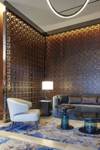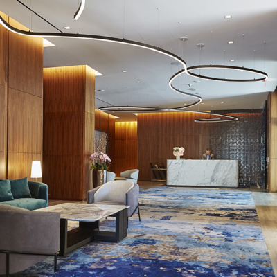 Assisting Chapi Chapo Design with an interior alteration of the lobby areas. Rich vertical grained wood veneer panelling accentuate the space with matted hardwood flooring. A contrasting blue with subtle hints of the wood panelling were selected for the carpeting to frame the intimate focal area. A curvilinear lighting is suspended from above and also tied in at dedicated task lighting areas. Artwork is subtly introduced to balance with the gypsum wallboard ceilings. Privacy screens with illumination create semi-transparent planes.